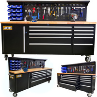 Duży stół warsztatowy z drewnianym blatem, szafką oraz szufladami JCB