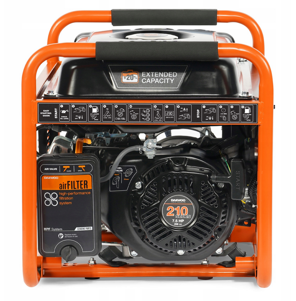 Sercem urządzenia jest 4-suwowy silnik benzynowy Daewoo o mocy 7,5 KM, spełniający normę emisji spalin Euro 5, co przekłada się na nowoczesną, oszczędną i czystszą pracę. Duży zbiornik paliwa 18 l gwarantuje nawet 15 godzin działania przy połowie obciążenia, a rozruch elektryczny (E-Start) oraz ręczny ułatwia korzystanie z agregatu w każdych warunkach. To solidny generator do domu, na działkę, do warsztatu i na plac budowy.