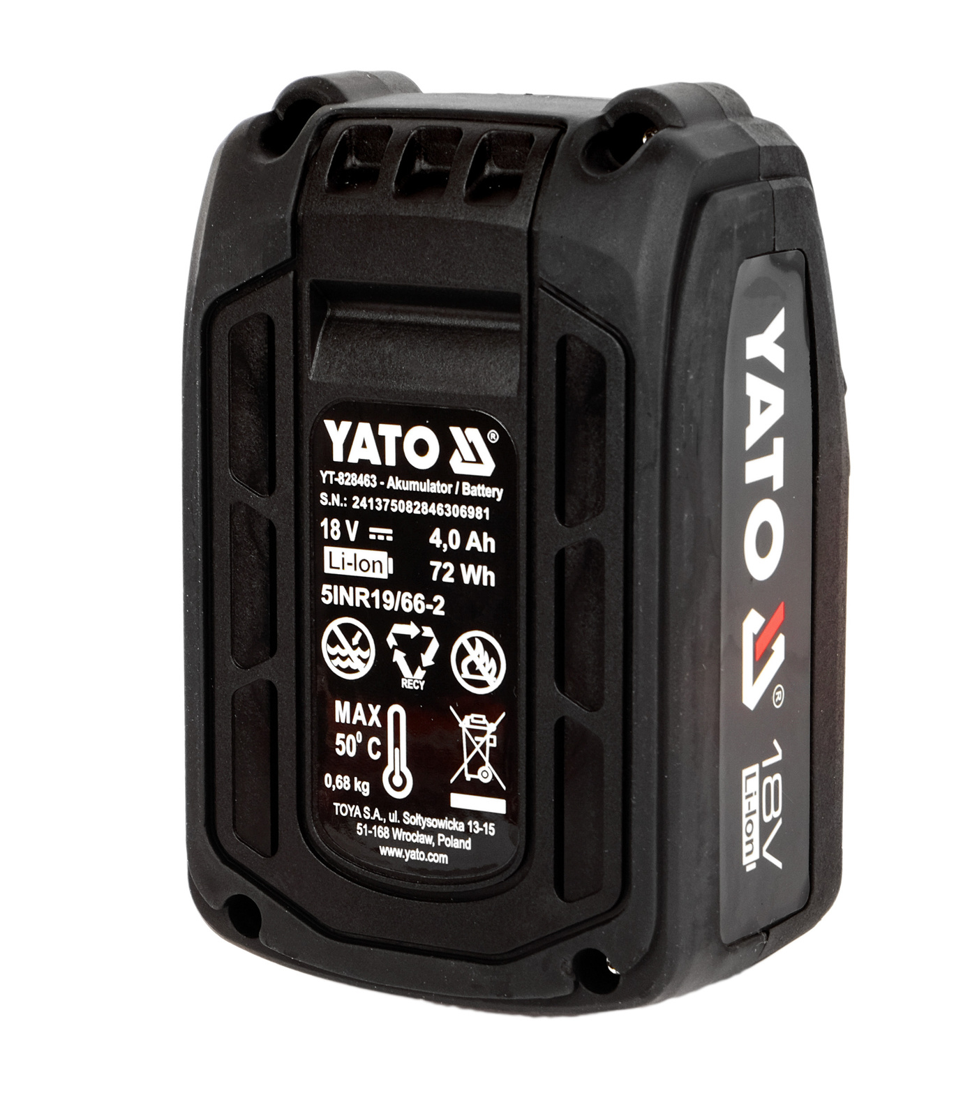 Akumulator zasilający serię elektronarzędzi YATO platformy 18V. Posiada udoskonalony system ochrony ogniw przed przegrzaniem oraz pełnym rozładowaniem w stanie spoczynku. Maksymalny prąd wyjściowy wynosi 40 A, co dla akumulatora 6 Ah jest jednym z najlepszych wyników w tej klasie i pozwala na wielogodzinną pracę z wkrętarką, wyrzynarką i wieloma innymi narzędziami.