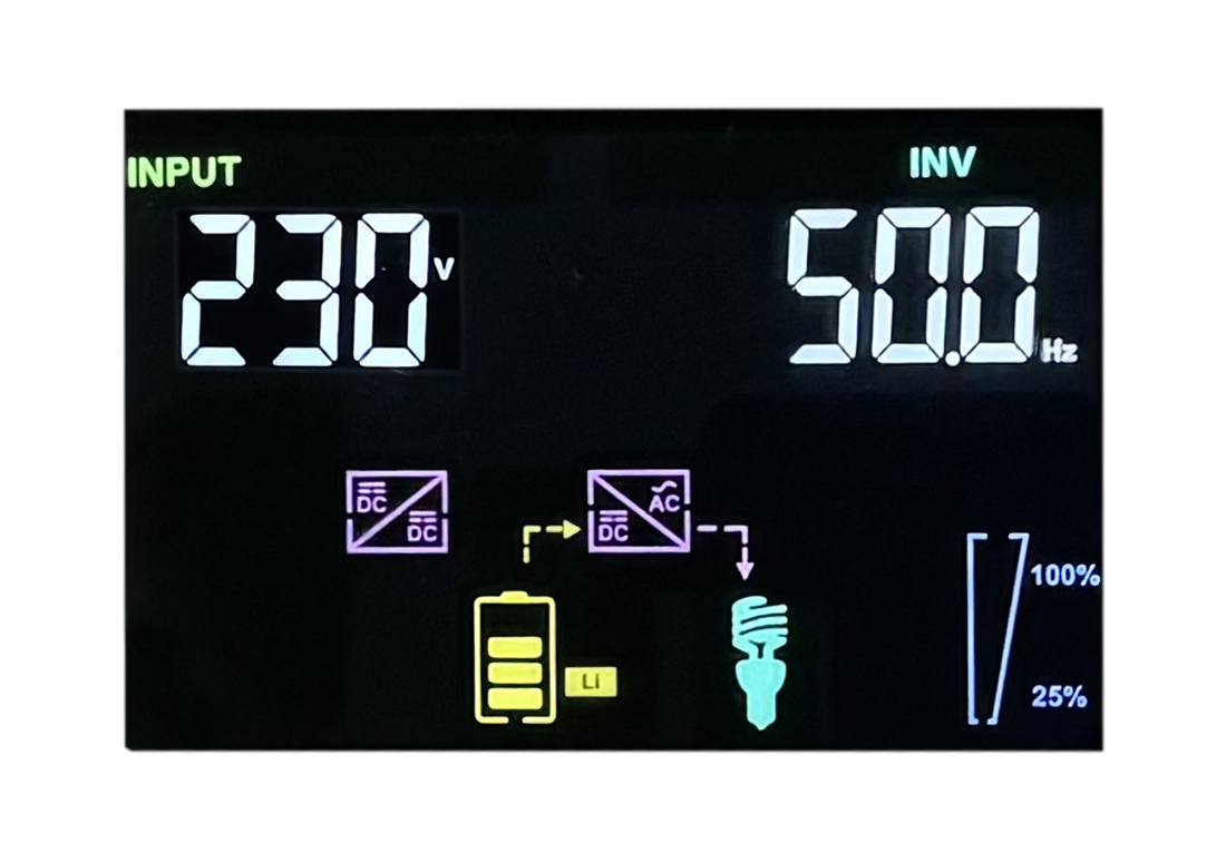 - Wyświetlacz LCD, informujący o aktualnym stanie pracy urządzenia m.in. napięciu wejściowym i wyjściowym, napięciu i ładowaniu baterii