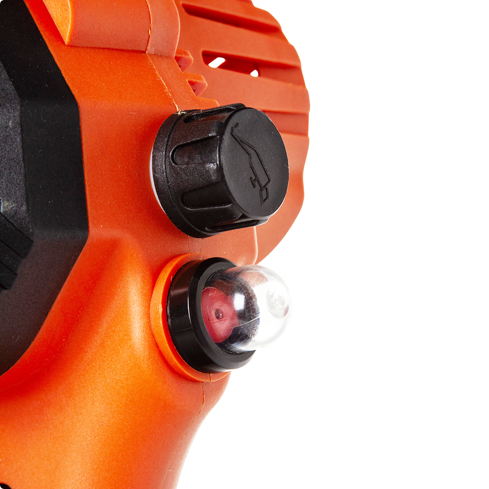Antypoślizgowa rękojeść umożliwia pewny chwyt podczas pracy. Dodatkowy przycisk na obudowie zabezpiecza przed przypadkowym uruchomieniem.