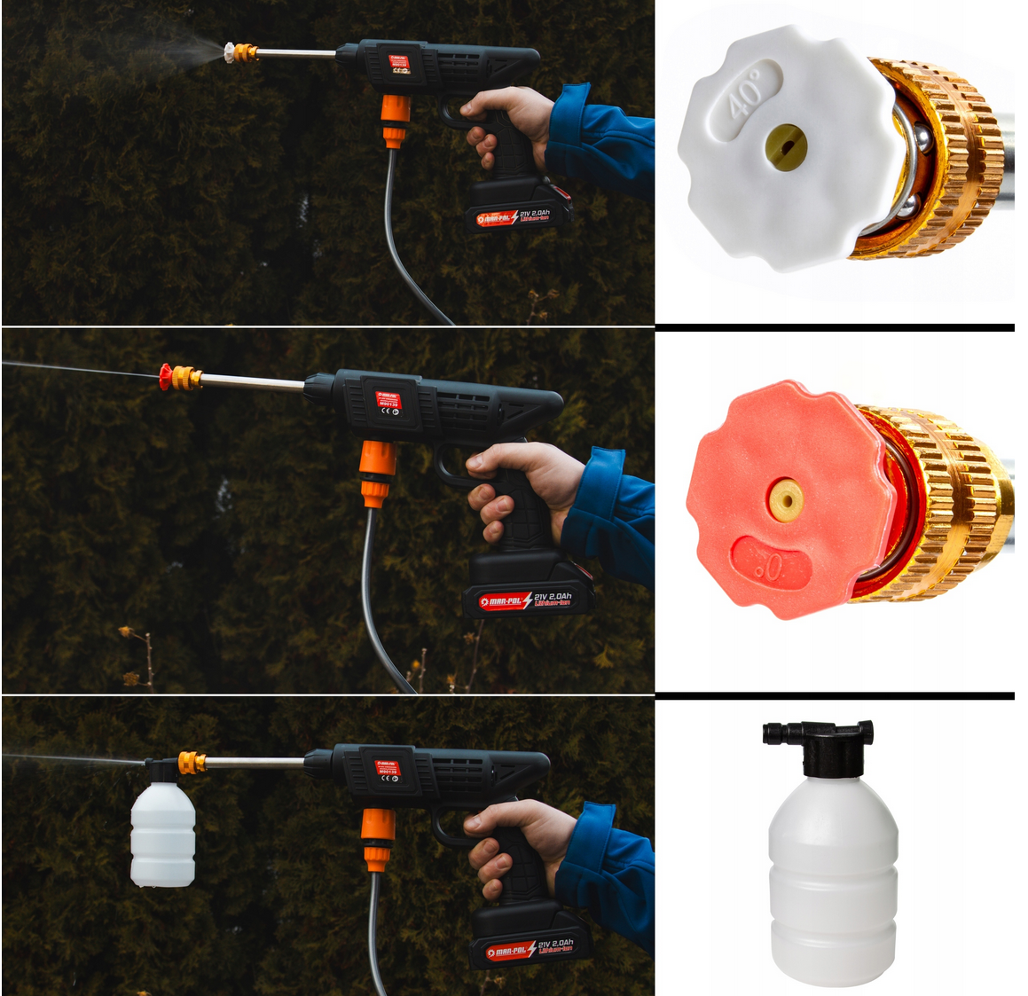 - Tryb prysznica (dysza 40°): szerszy zakres czyszczenia, podlewanie roślin, piana spłukująca.
