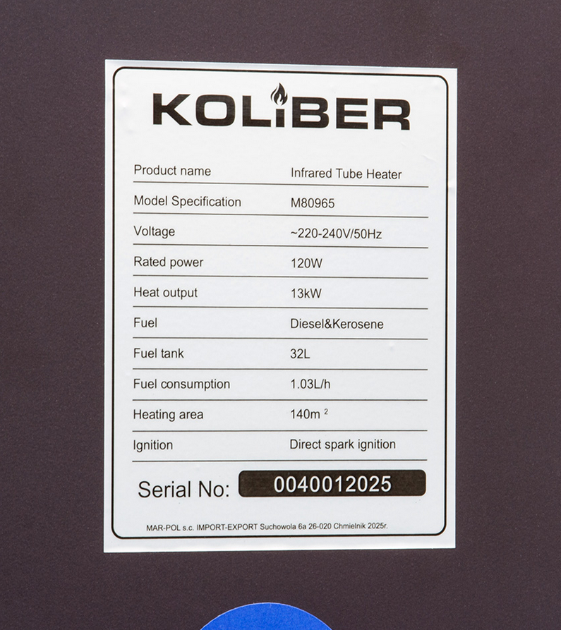 Nagrzewnica olejowa na podczerwień KOLIBER® 13 kW to nowoczesne urządzenie grzewcze stworzone do efektywnego ogrzewania zarówno przestrzeni otwartych, jak tarasy czy stanowiska robocze, jak i pomieszczeń zamkniętych — takich jak warsztaty, garaże, magazyny czy hale usługowe.