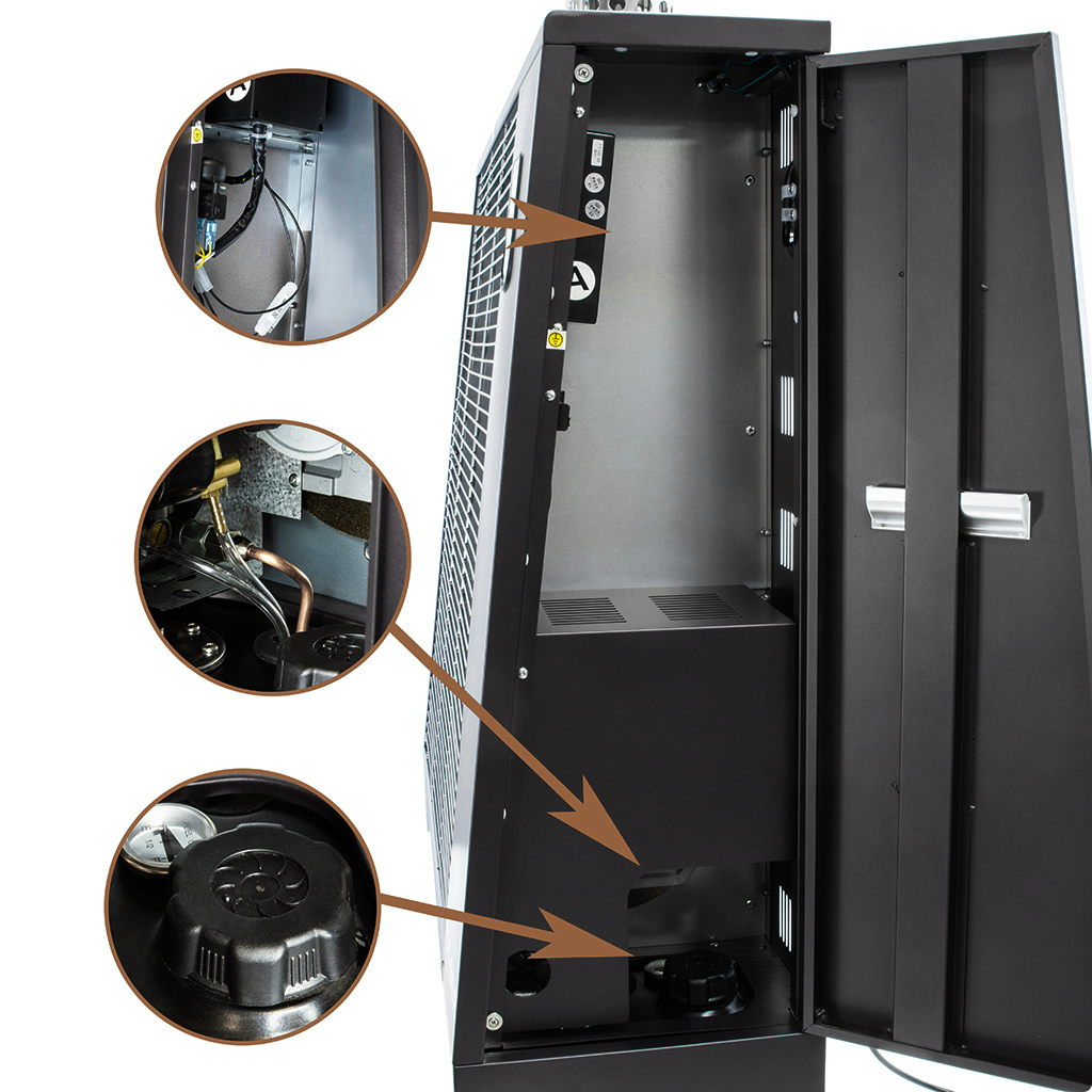 Moc 16 000 W pozwala skutecznie ogrzewać pomieszczenia o powierzchni nawet 180 m², co czyni ten model jednym z najefektywniejszych w swojej kategorii.
