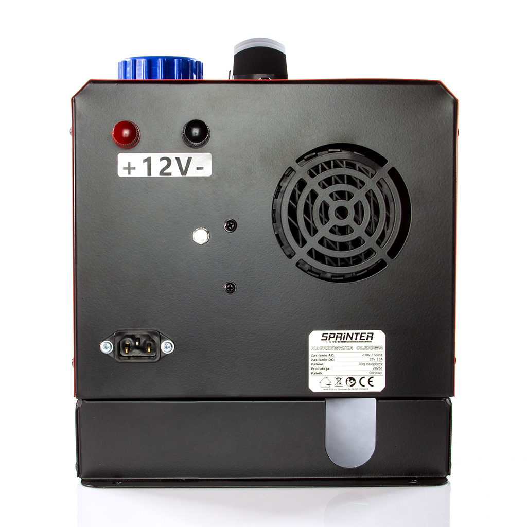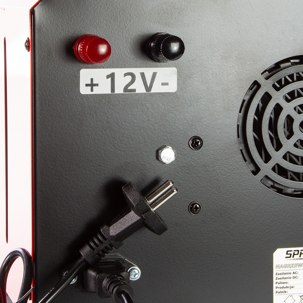Nagrzewnicę można podłączyć pod zasilanie z sieci AC 230V/50Hz co umożliwia ogrzewanie pomieszczeń, magazynów, garaży, lub pod zapalniczkę samochodową lub akumulator DC 12V 15A dzięki czemu bez problemu można ogrzać pojazd lub przyczepę kempingową.