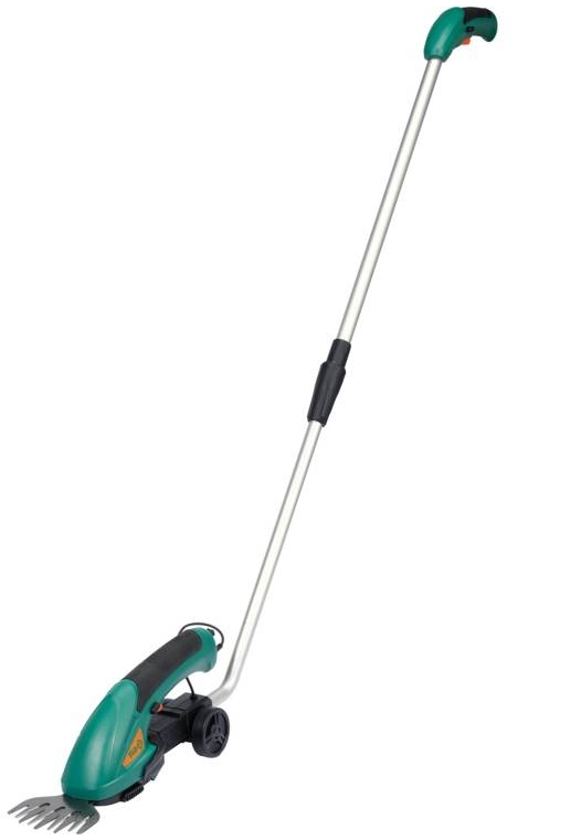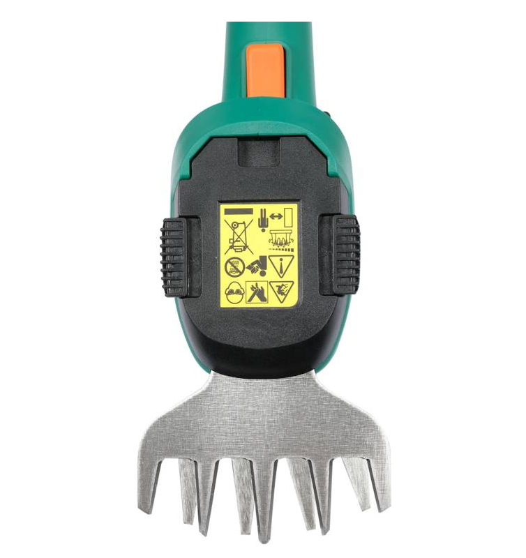 Nożyce posiadają wymienne przystawki: do podcinania trawy 90mm i do podcinania żywopłotu 120mm.