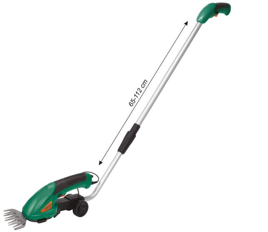Podstawa z kółkami i teleskopowy drążek regulowany w zakresie od 65cm do 112cm umożliwiają prowadzenie nożyc i przycinanie zieleni w pozycji wyprostowanej.