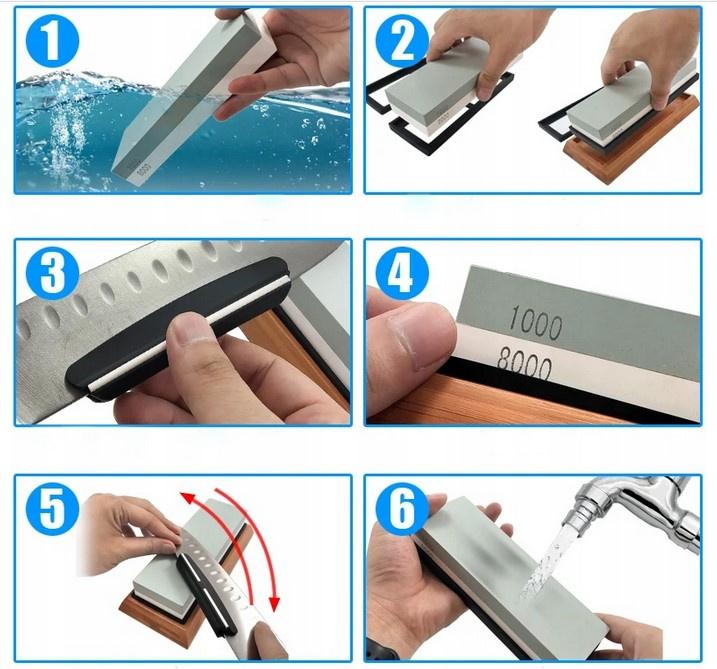 To narzędzie, które wynosi ostrzenie noży na zupełnie nowy poziom! Zawiera dwa dwustronne kamienie wodne o czterech różnych gradacjach: 400/1000/3000/8000, dzięki czemu możesz wykonać pełen proces – od regeneracji po lustrzane polerowanie