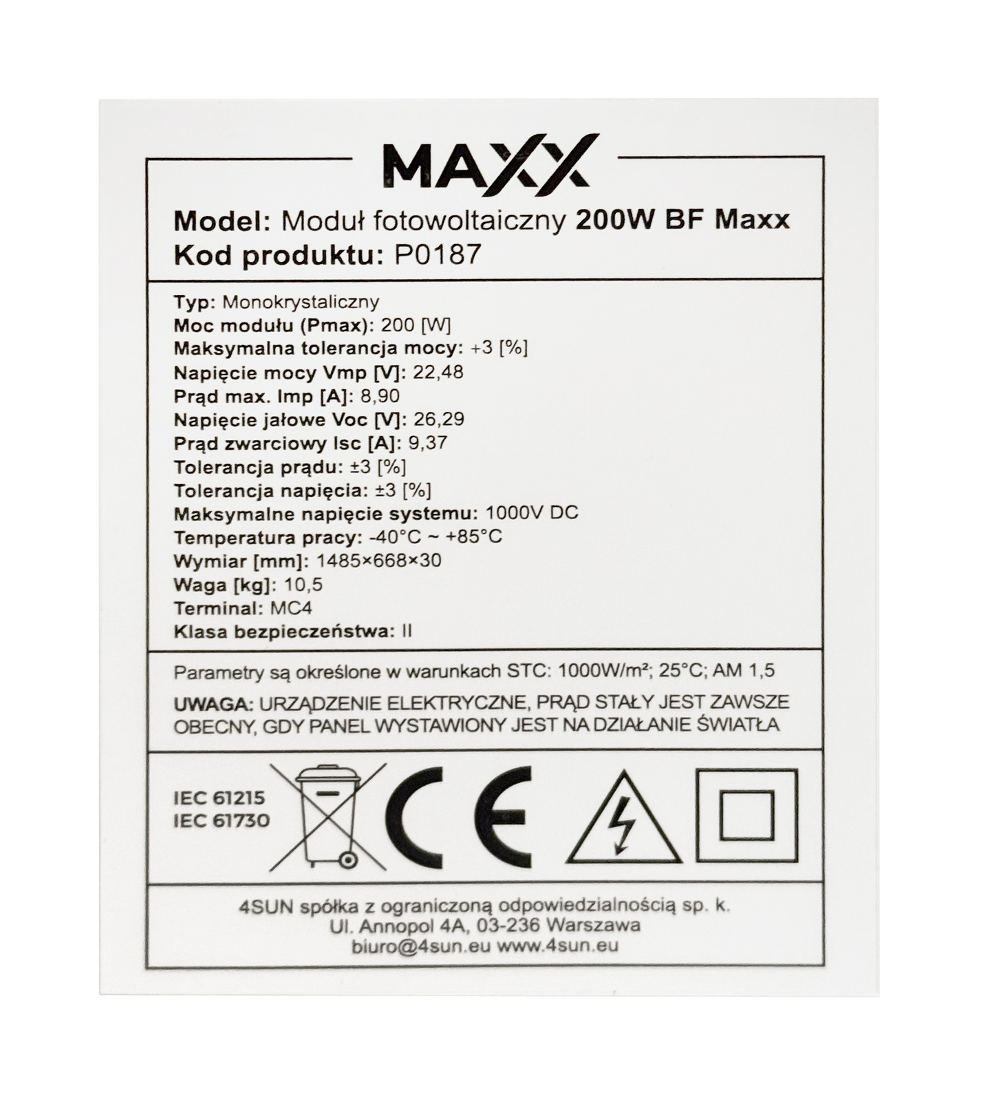 PANEL SOLARNY FOTOWOLTAICZNY MONOKRYSTALICZNY BATERIA SŁONECZNA 12V 200W 4SUN