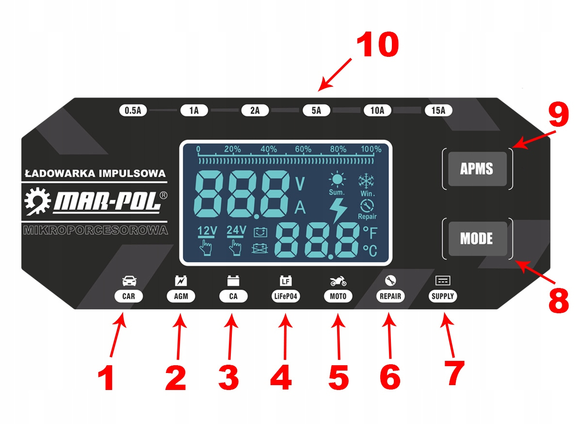 (AGM, GEL, WET, EFB, LEAD-ACID, LiFePO4, Deep-Cycle)REPAIR MODE – 10-stopniowy tryb naprawy akumulatora