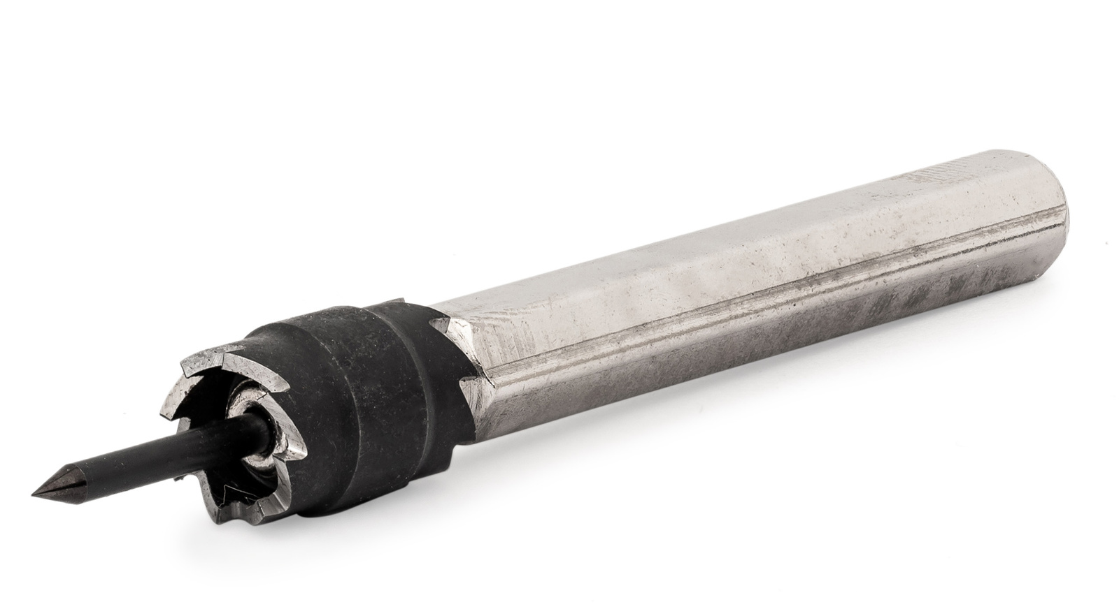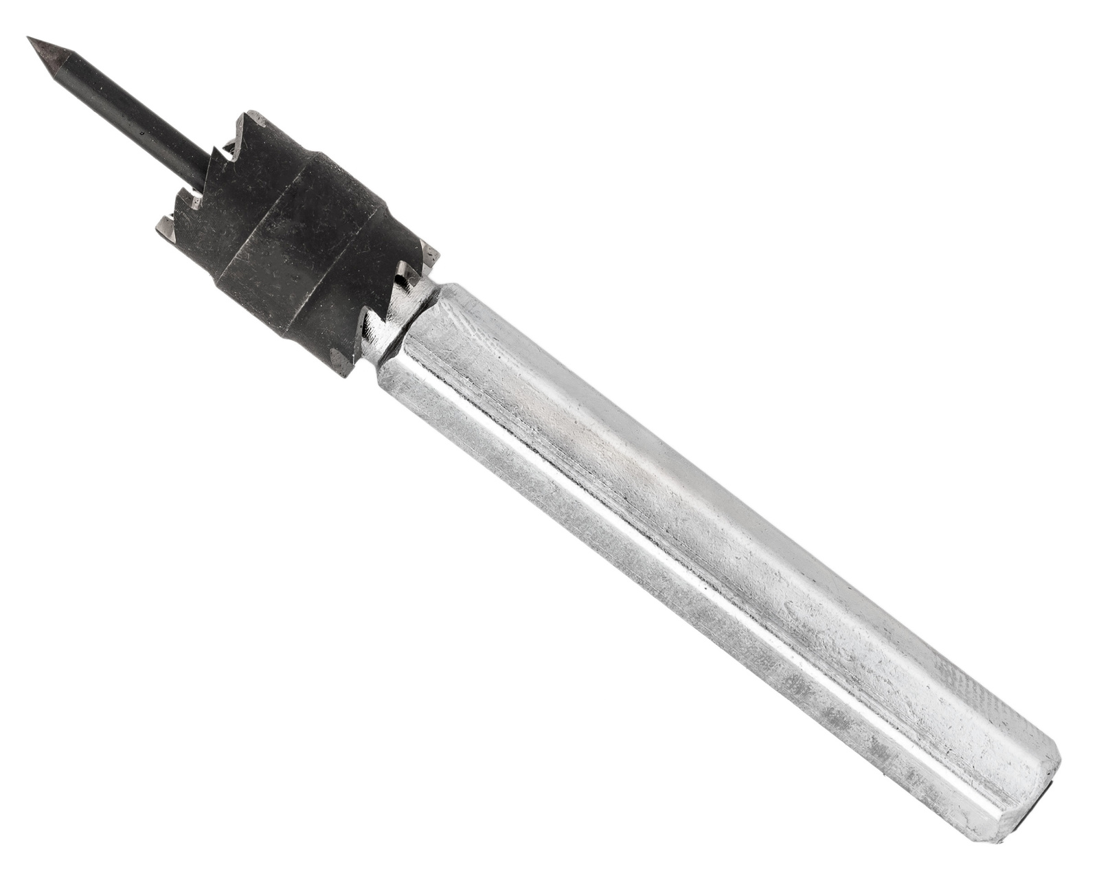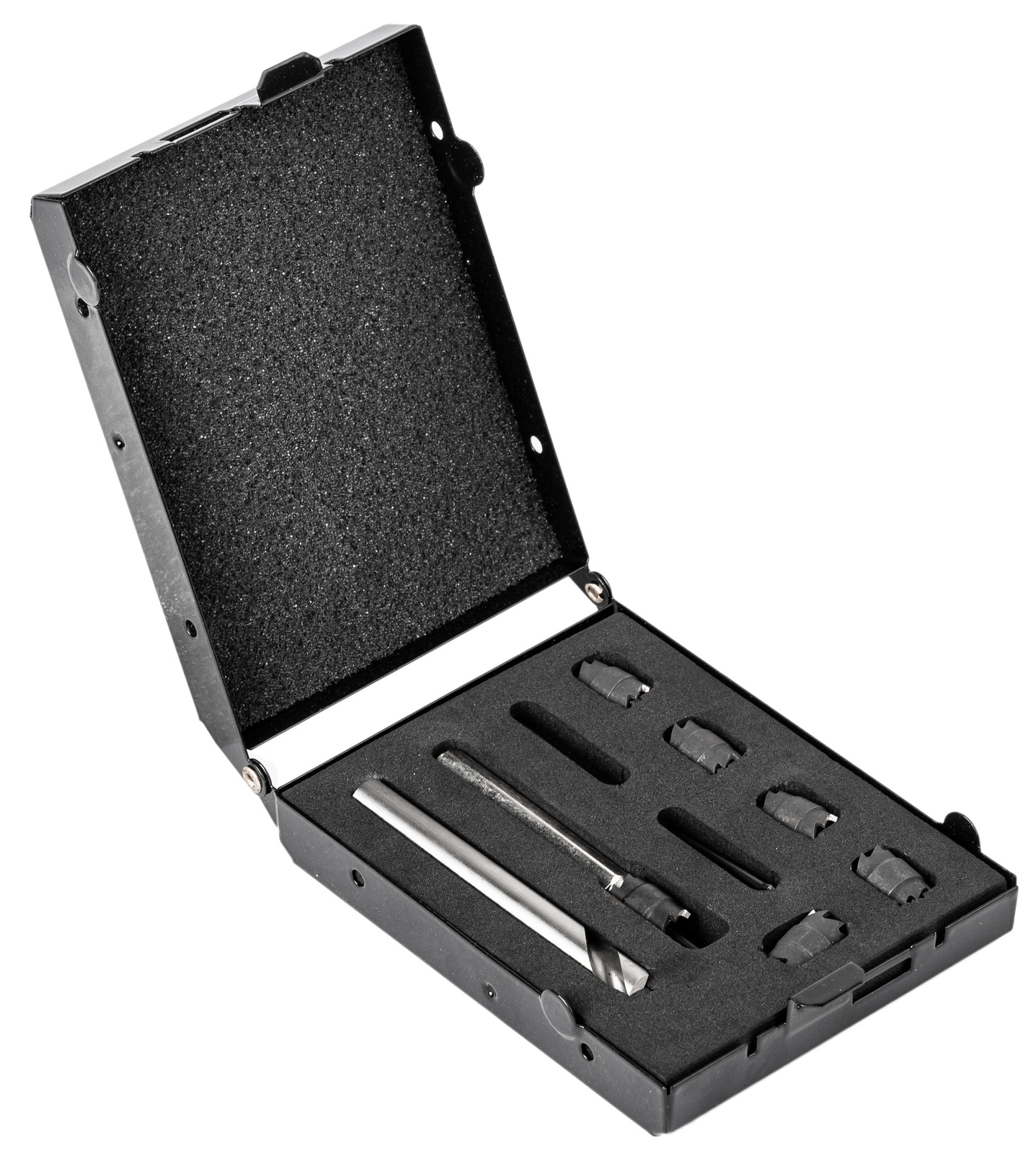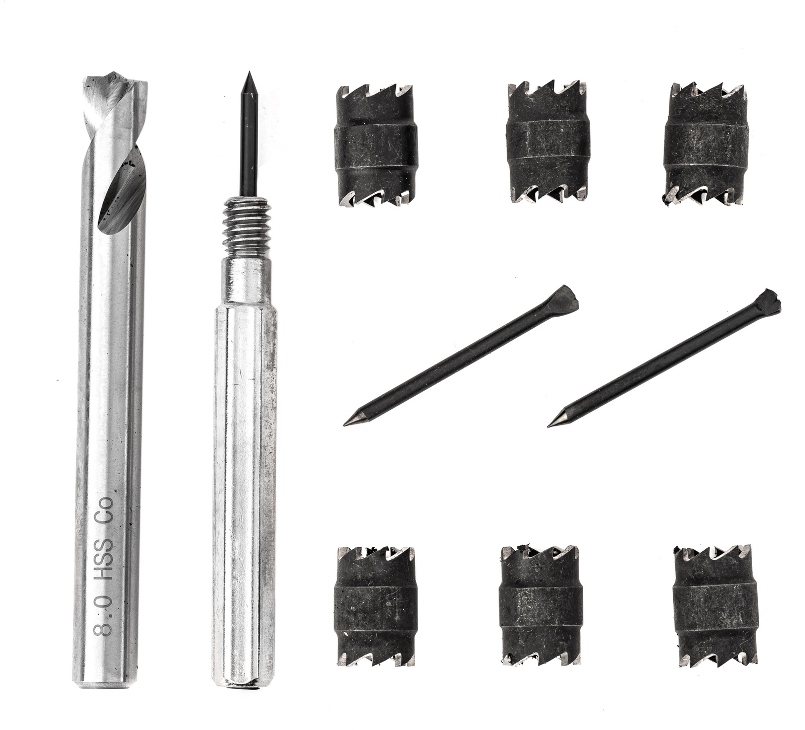 Zawiera 6 dwustronnych frezów koronkowych, uchwyt mocujący, 3 trzpienie ustalające oraz specjalne wiertło HSS 8 mm.