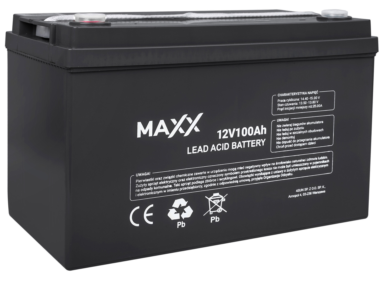 Akumulator 100 Ah – zapewnia długi czas podtrzymania zasilania, nawet do kilkunastu godzin pracy przy mniejszym obciążeniu.