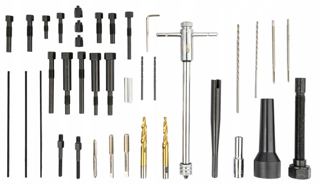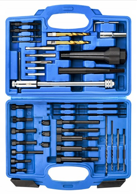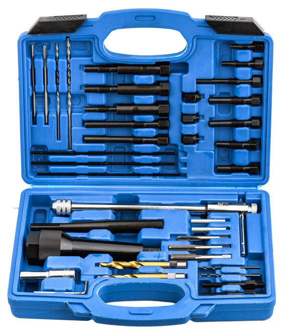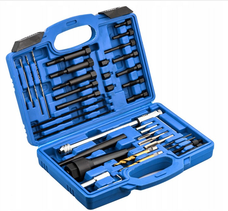 Zestaw do wyciągania i demontażu urwanych świec żarowych oraz regeneracji gwintu w głowicy podczas wymiany świec. System do naprawy gwintowanego gniazda świecy żarowej, metodą nowej generacji zapewnia szybką tanią i bezpieczną naprawę.