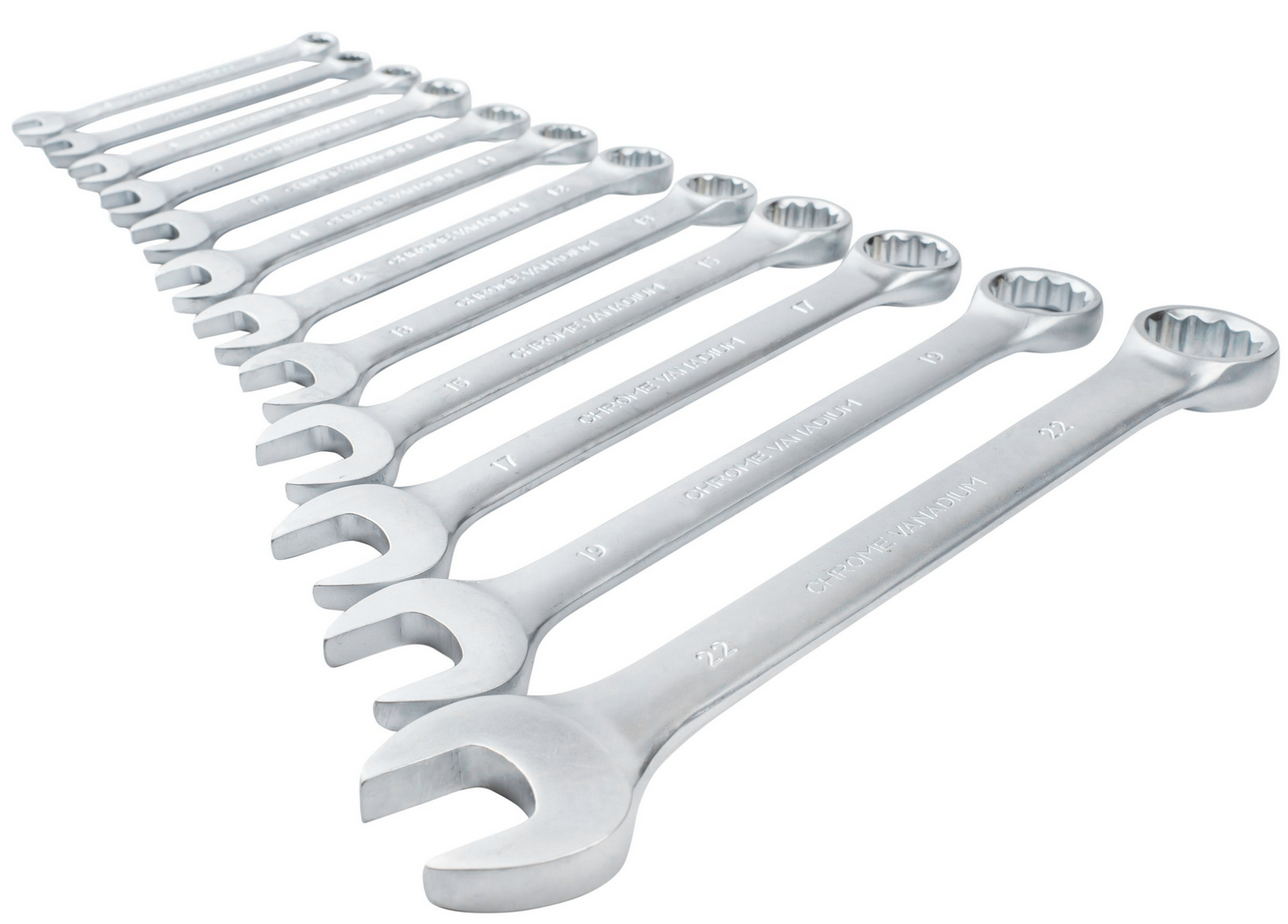 Zestaw kluczy nasadowych oraz płasko-oczkowych, wykonanych z materiału chromowo-vanadowego ( CRV-50 – stal narzędziowa)