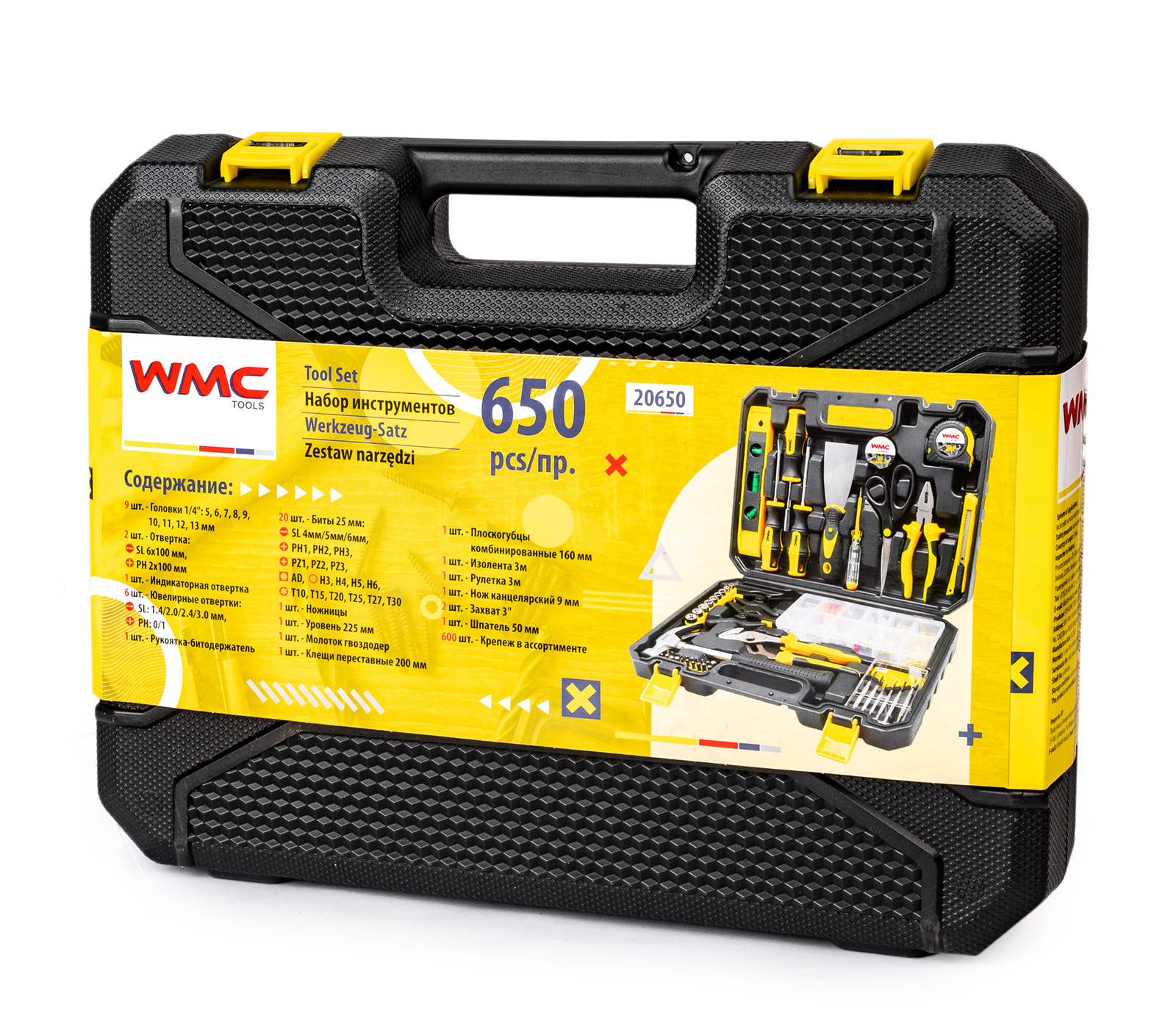 Zestaw narzędziowy klucze nasadowe wkrętaki bity nasadki walizka 650 elem. WMC