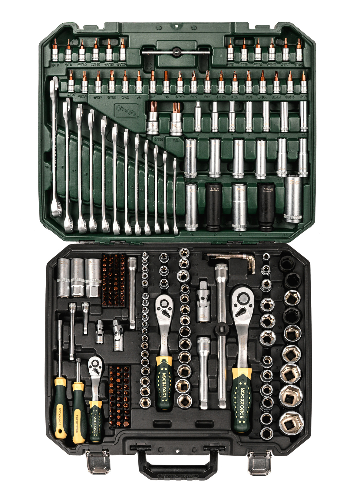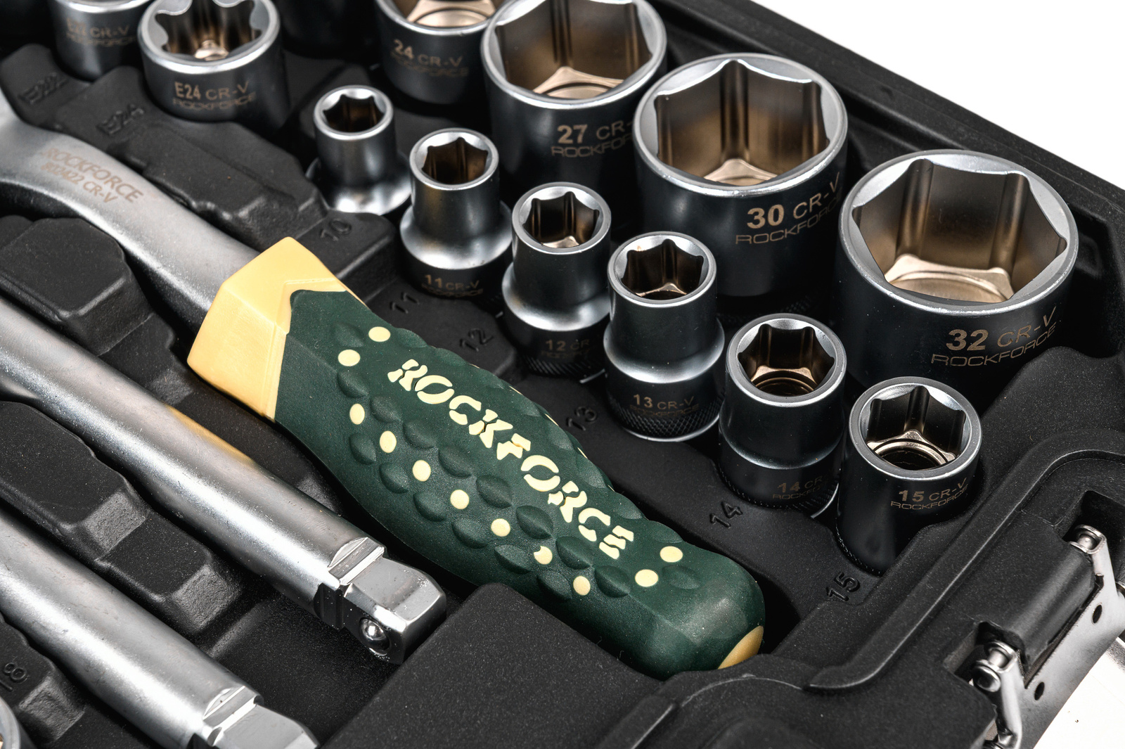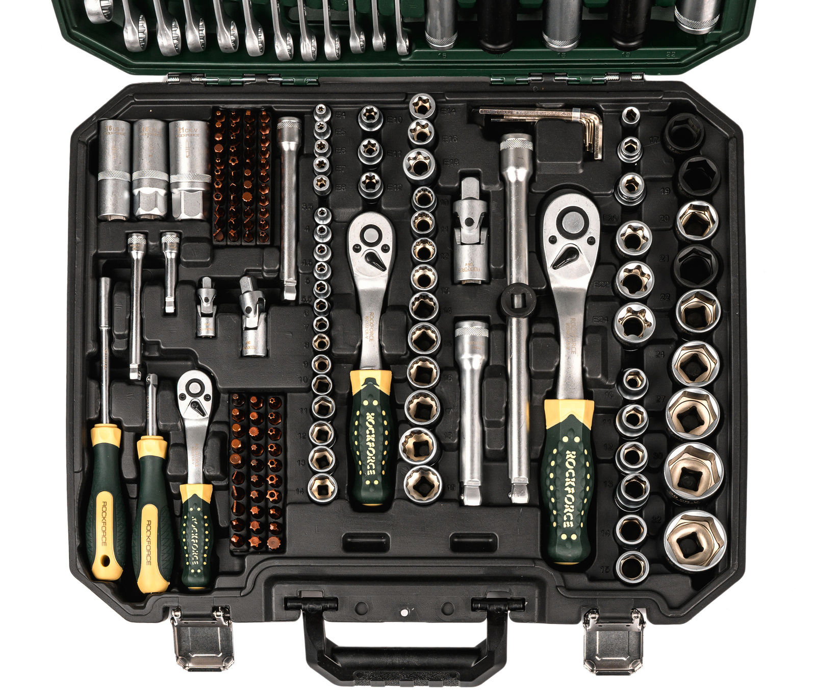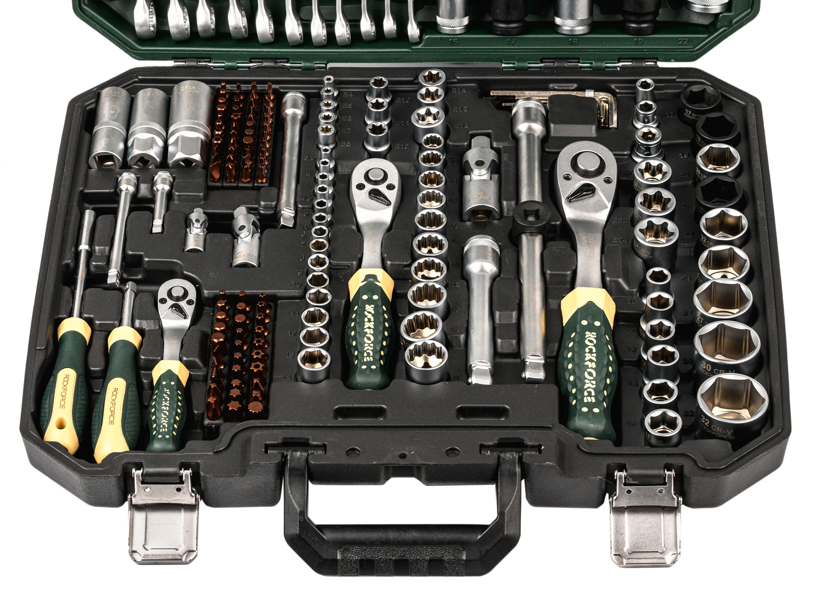 W odróżnieniu od tanich zestawów kluczy, elementy w zestawie Rockforce nie wypadają ze swoich miejsc a zapięcia mocno trzymają złożoną walizkę i uniemożliwiają przypadkowe jej otwarcie np. w bagażniku.