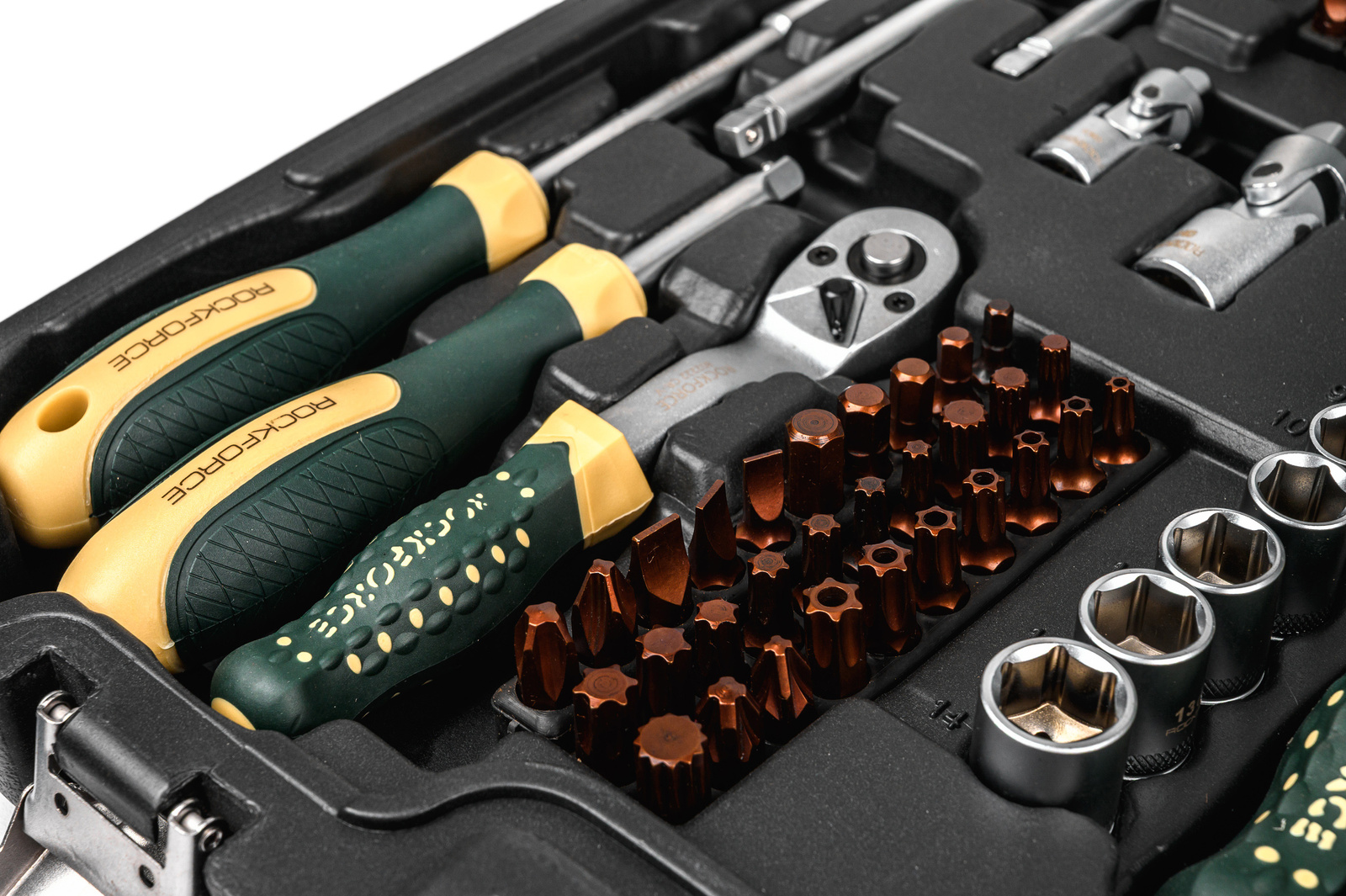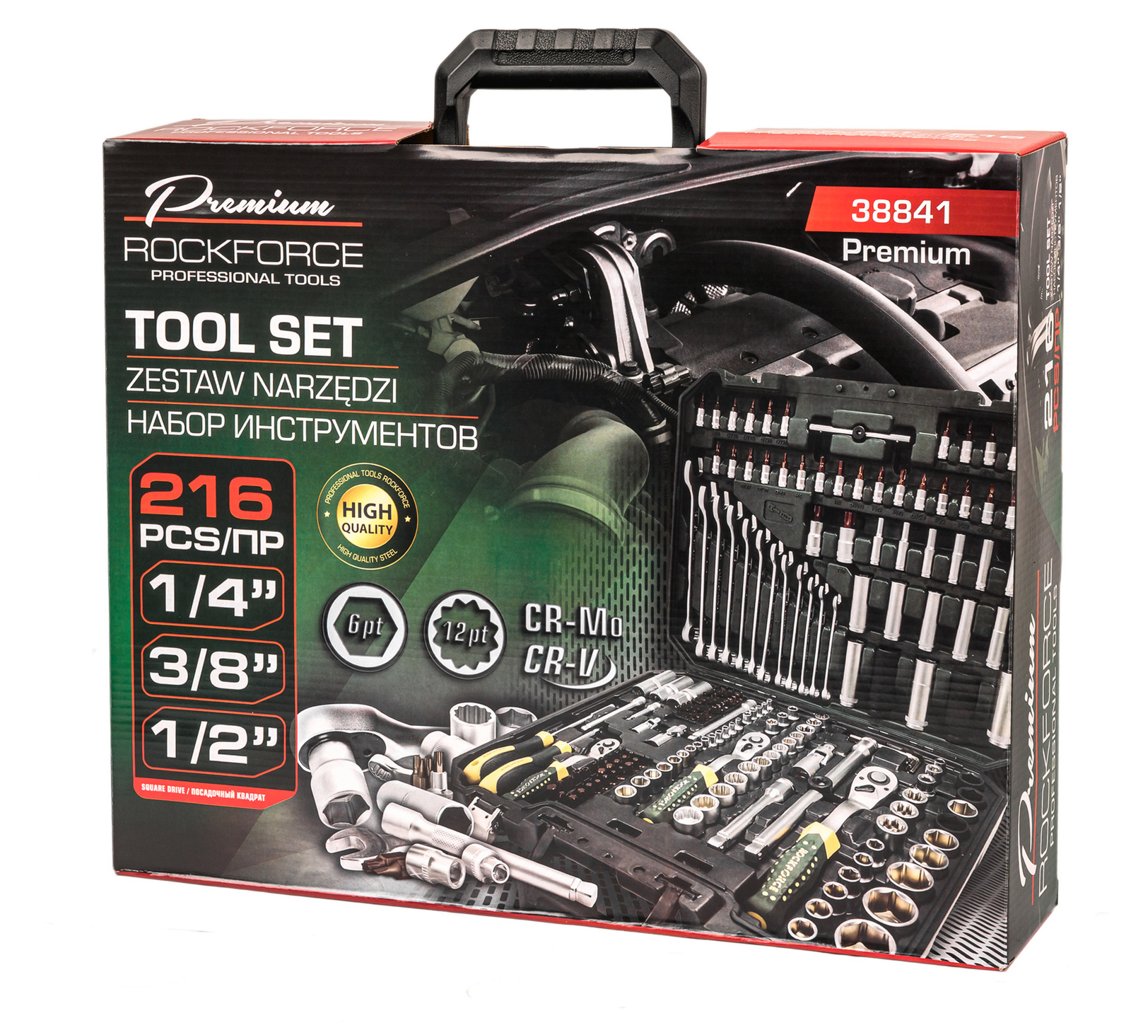 Uniwersalny zestaw narzędziowy składający się z 216 elementów renomowanej marki Rockforce.