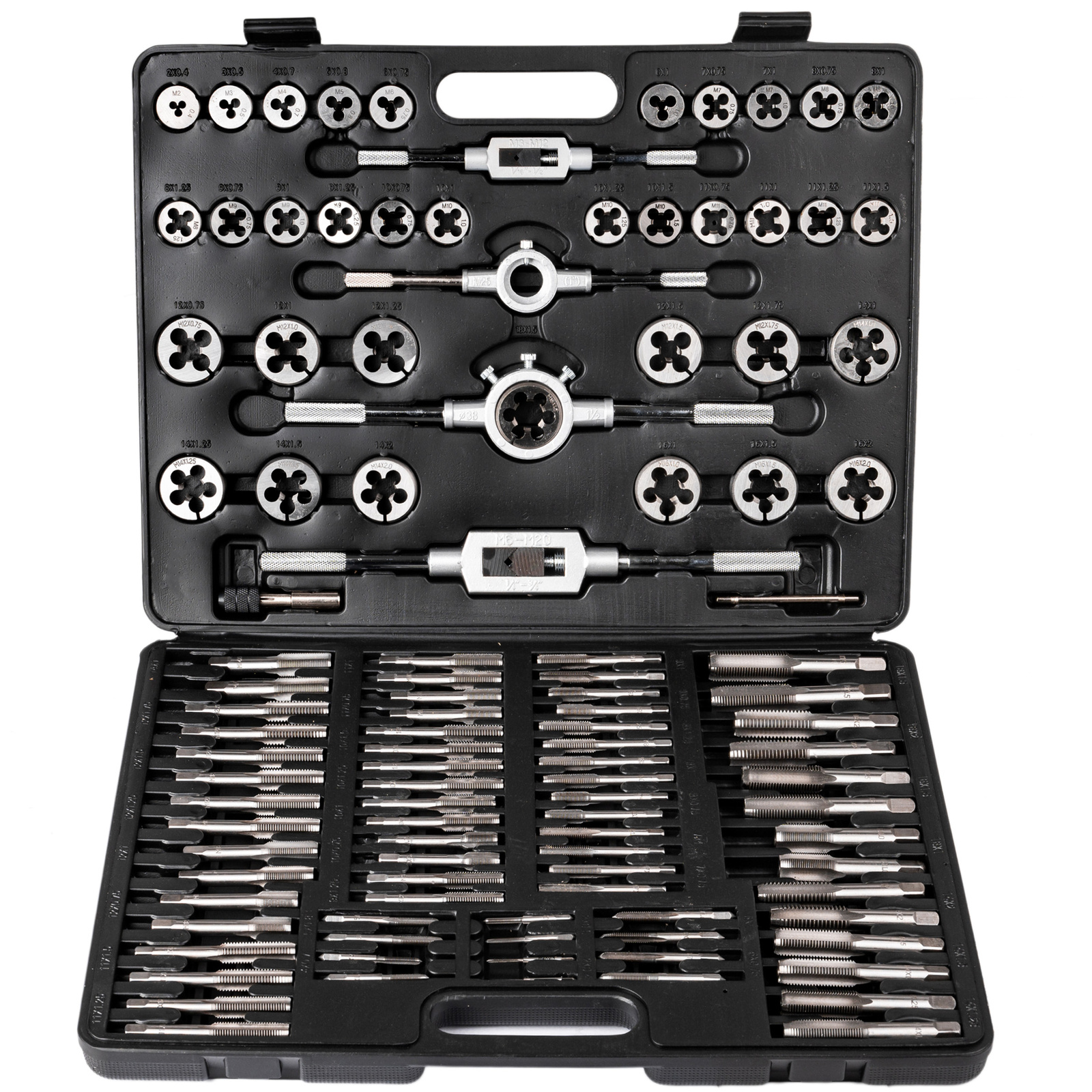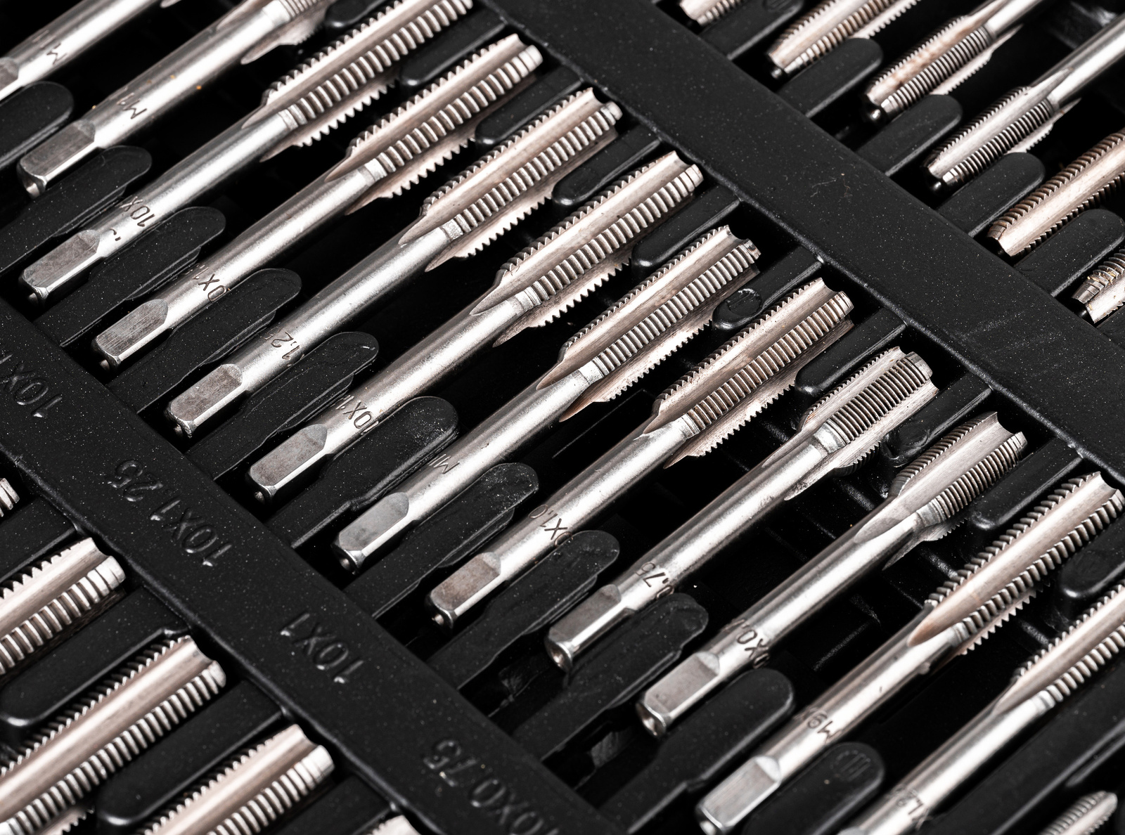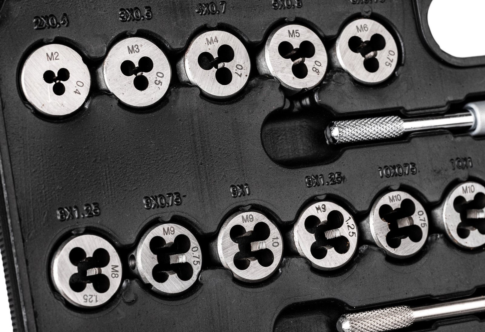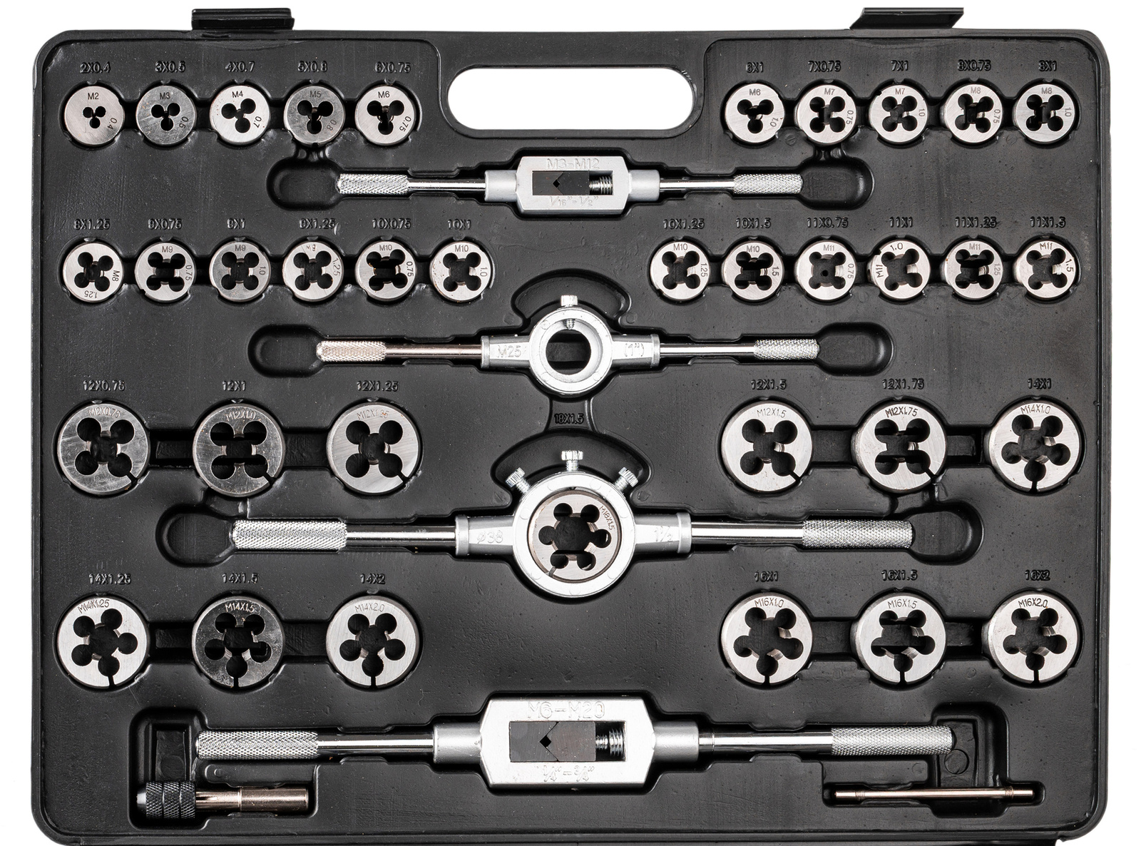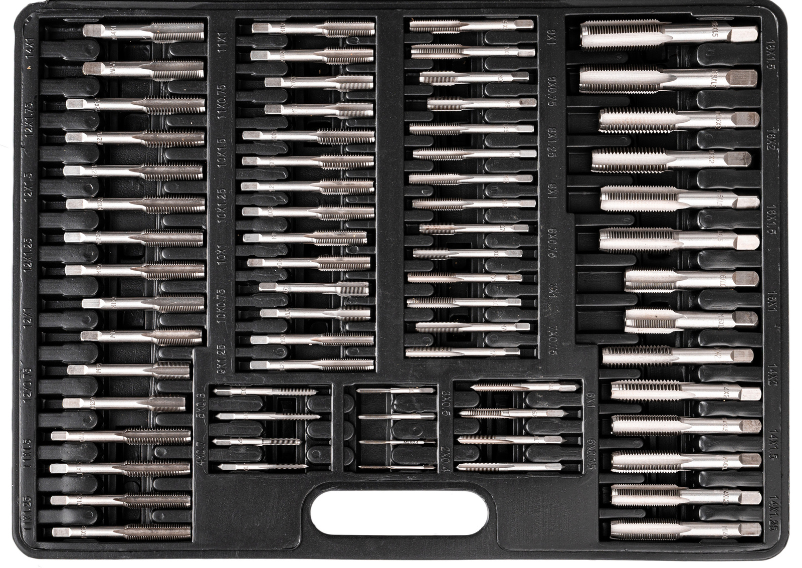 - 35 x 2szt. gwintowników: M2x0,4mm; M3x0,5mm; M4x0,7mm; M5x0,8mm; M6x0,75mm; M6x1,0mm; M7x0,75mm; M7x1,0mm; M8x0,75mm; M8x1,0mm; M8x1,25mm; M9x0,75mm; M9x1,0mm; M9x1,25mm; M10x0,75mm; M10x1,0mm; M10x1,25mm; M10x1,5mm; M11x0,75mm; M11x1,0mm; M11x1,25mm; M11x1,5mm; M12x0,75mm; M12x1,0mm; M12x1,25mm; M12x1,5mm; M12x1,75mm; M14x1,0mm; M14x1,25mm; M14x1,5mm; M14x2,0mm; M16x1,0mm; M16x1,5mm; M16x2,0mm; M18x1,5mm;