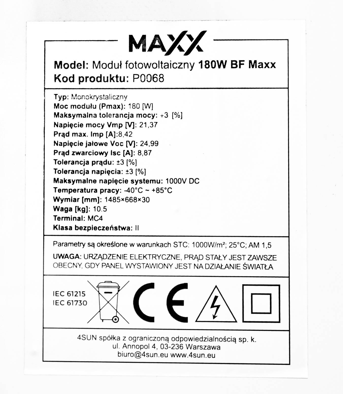 PANEL SŁONECZNY 180W MAXX zalicza się do wysokiej jakości i trwałości paneli, które przeznaczone są do pracy w każdych warunkach pogodowych.