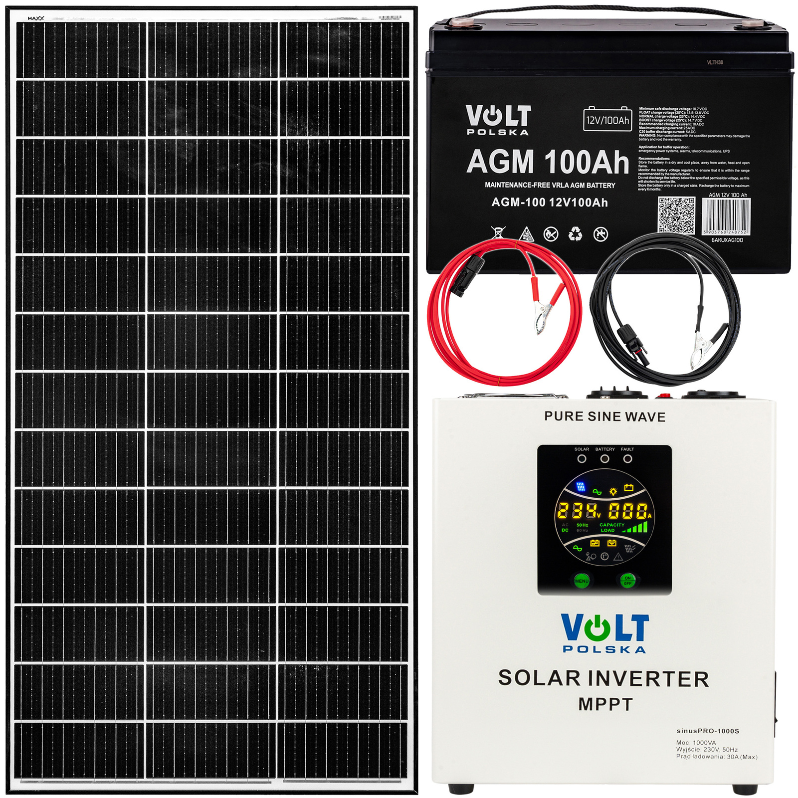 GOTOWY ZESTAW FOTOWOLTAICZNY 180W 100Ah (PANEL SOLARNY, PRZETWORNICA 1000S, AKUMULATOR, PRZEWODY)