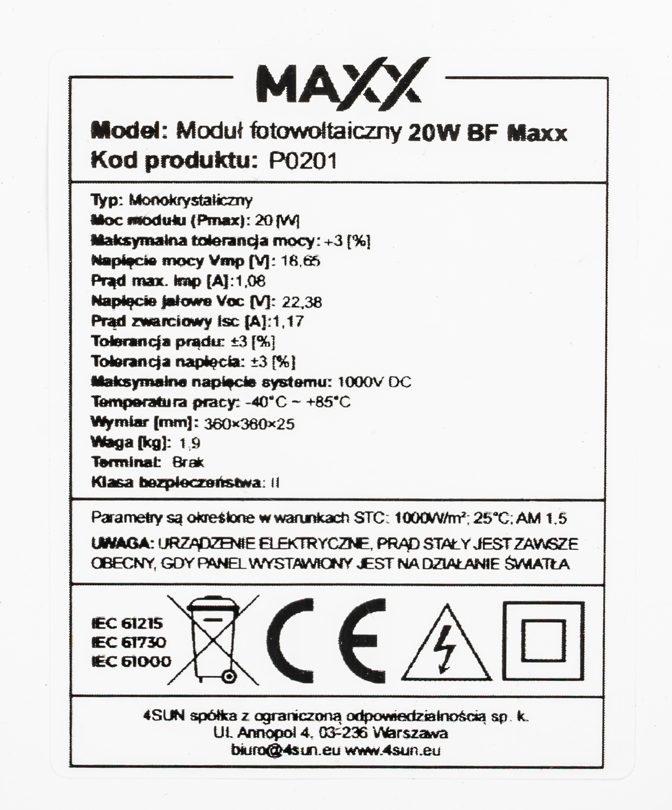 1. PANEL FOTOWOLTAICZNY MONOKRYSTALICZNY MAXX O MOCY 20W